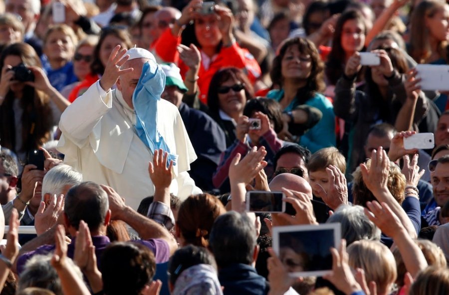 Папа Франциск махає рукою і намагається підхопити хустинку, кинуту вірянином, на площі Святого Петра у Ватикані, 16 жовтня 2013. STEFANO RELLANDINI, Ватикан
