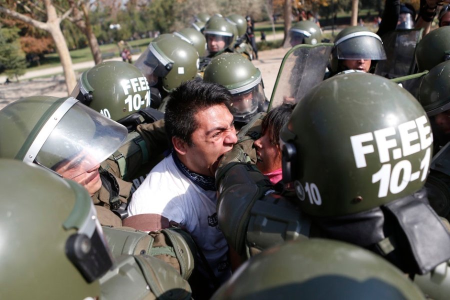 Протестуючий студент кусає поліцейського, який бере участь в розгоні мітингу, на якому учасники вимагали від уряду реформувати систему освіти, 8 травня 2013. IVAN ALVARADO, Чилі