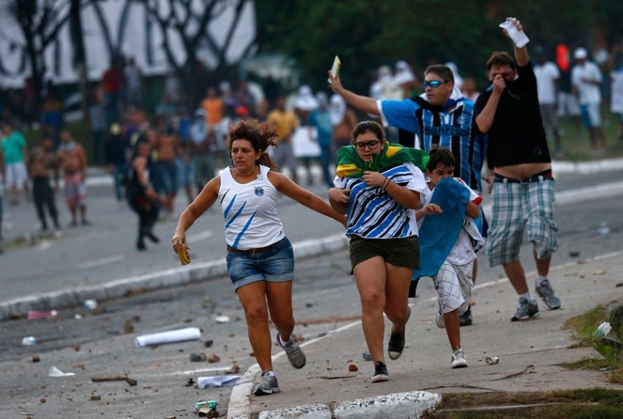 Сім'я з квитками на матч біжить в укриття, опинившись між поліцією і протестувальниками перед стадіоном незадовго до матчу між Нігерією та Уругваєм в Сальвадорі, 20 червня 2013. KAI PFAFFENBACH, Бразилія