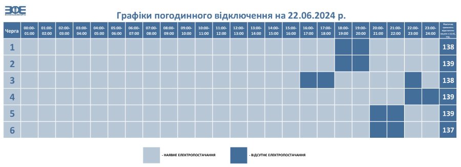 У суботу, 22 червня, обленерго застосовуватимуть графіки погодинних відключень електрики на всій території України.