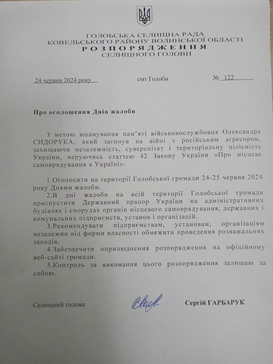 У зв’язку із загибеллю Олександра Сидорука 24-25 червня у Голобській громаді оголосили Днями жалоби.