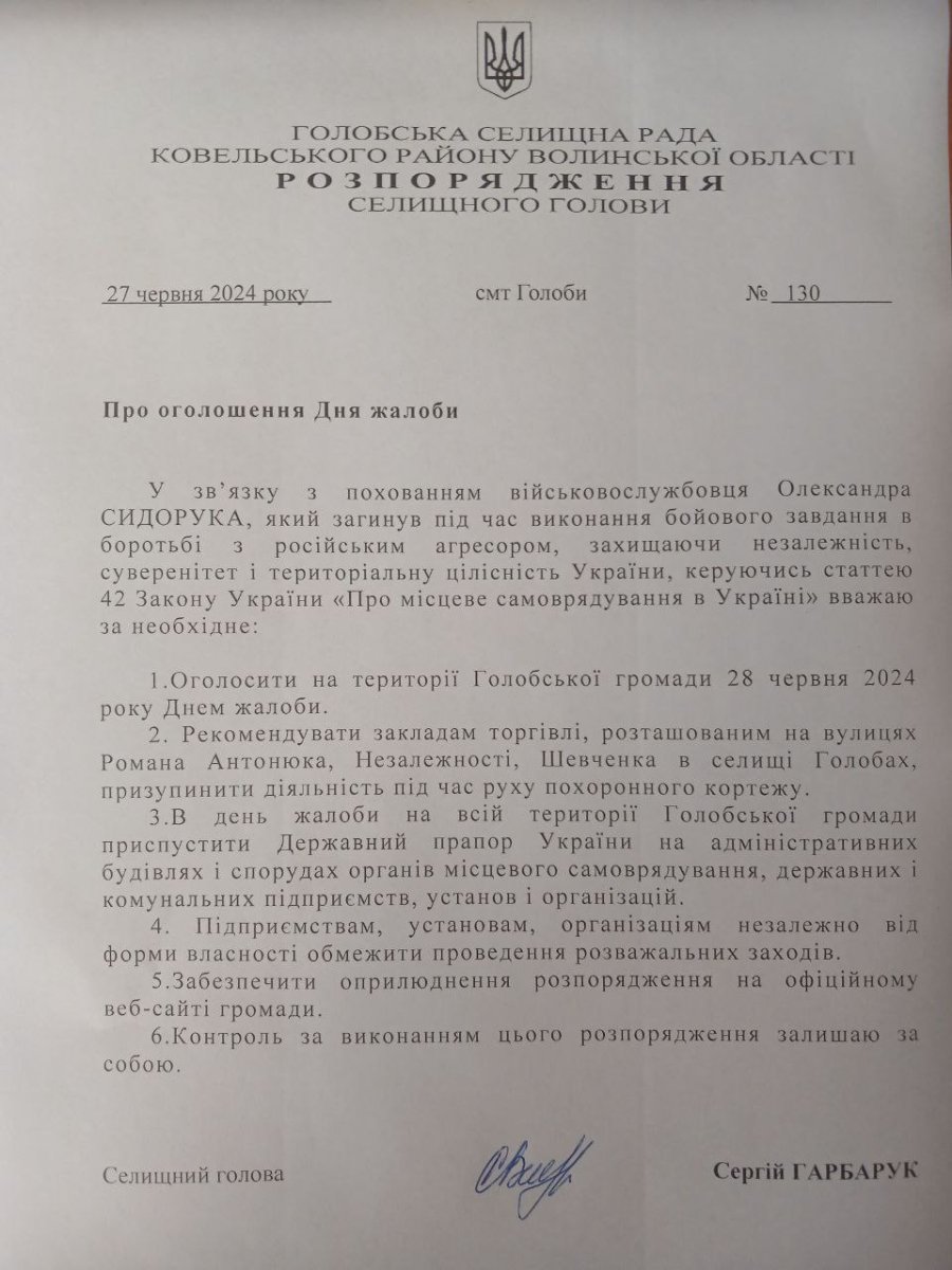 Мешканців Голобської громади Ковельського району закликають гідно зустріти «на щиті» полеглого військовослужбовця Олександра Сидорука.