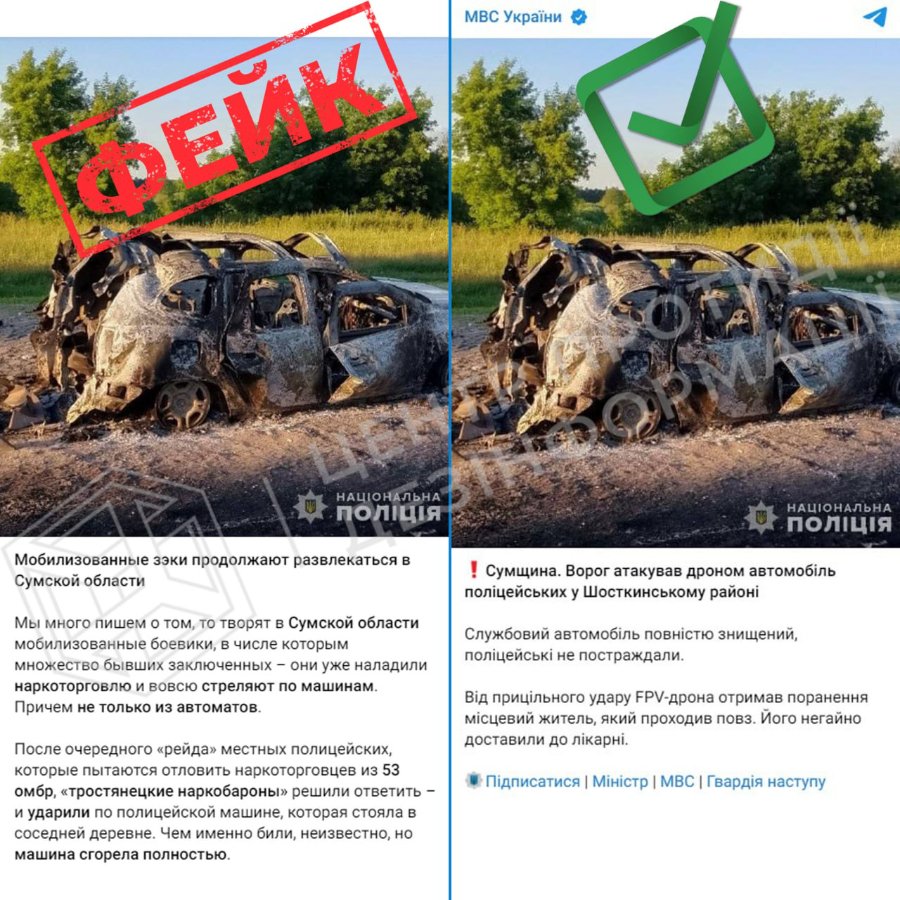 Насправді поширювана рашистами інформація не відповідає дійсності. Взявши за основу новину від МВС України про атаку російського дрона по поліцейській машині, ru-пропагандисти вигадали свою історію, мета якої – дискредитувати мобілізаційний процес.