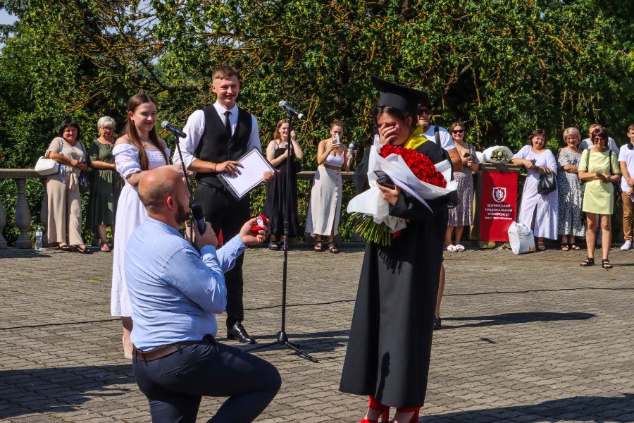 Варто зазначити, що для когось свято стало подвійним і набуло нового сенсу. Після вручення документа про освіту коханий однієї з випускниць подарував їй букет троянд і зробив пропозицію руки та серця. Під гучні оплески вона сказала: «Так!».