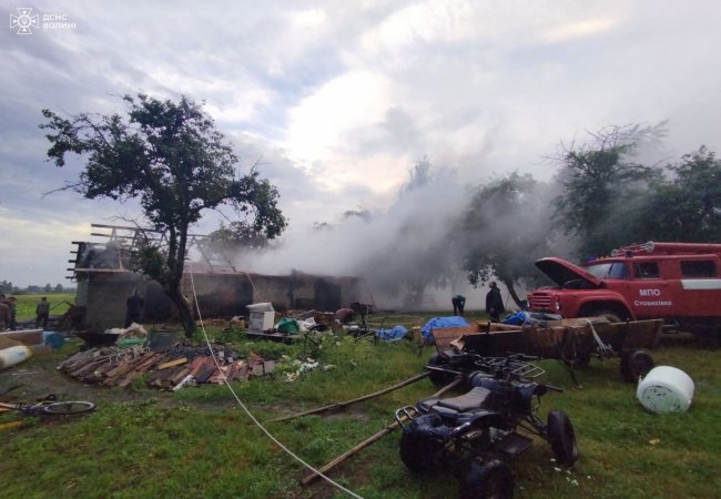 17 липня о 21:24 до служби порятунку 101 надійшло повідомлення про пожежу господарчої споруди у с. Воля Ковельського району. На місце виклику прибули рятувальники 19 ДПРЧ м.Ковель та МПО с. Доротище, які подали на гасіння 3 водяних ствола. Пожежу ліквідували о 22:43. Потерпілих немає. Причина пожежі: розряд блискавки.