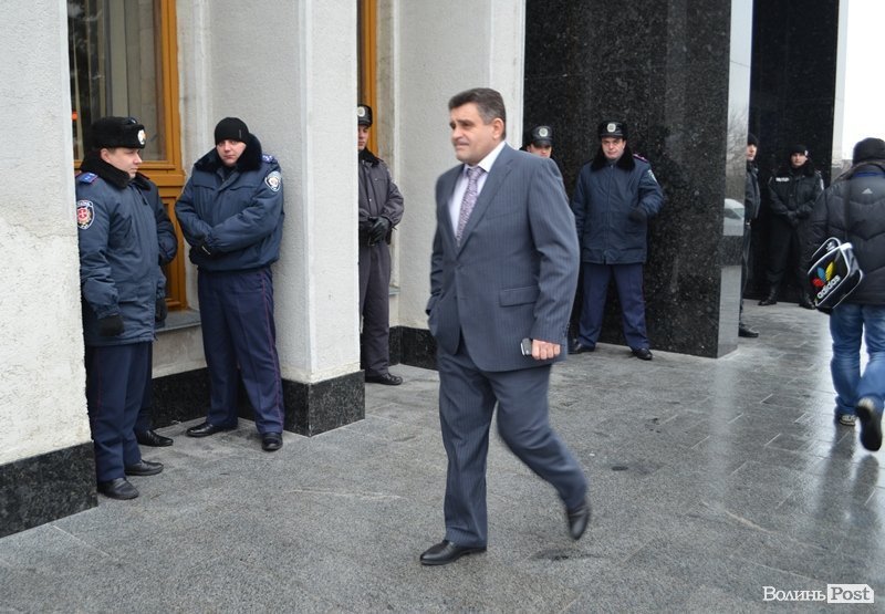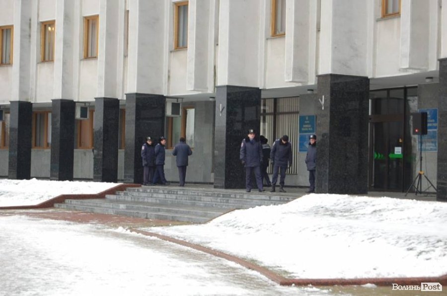 Біля бокового входу порядок охороняють щонайменше 30 правоохоронців. Також на місці події присутні головний міліціонер Волині Олександр Терещук, начальник луцького міськвідділу МВС Василь Марчишак.