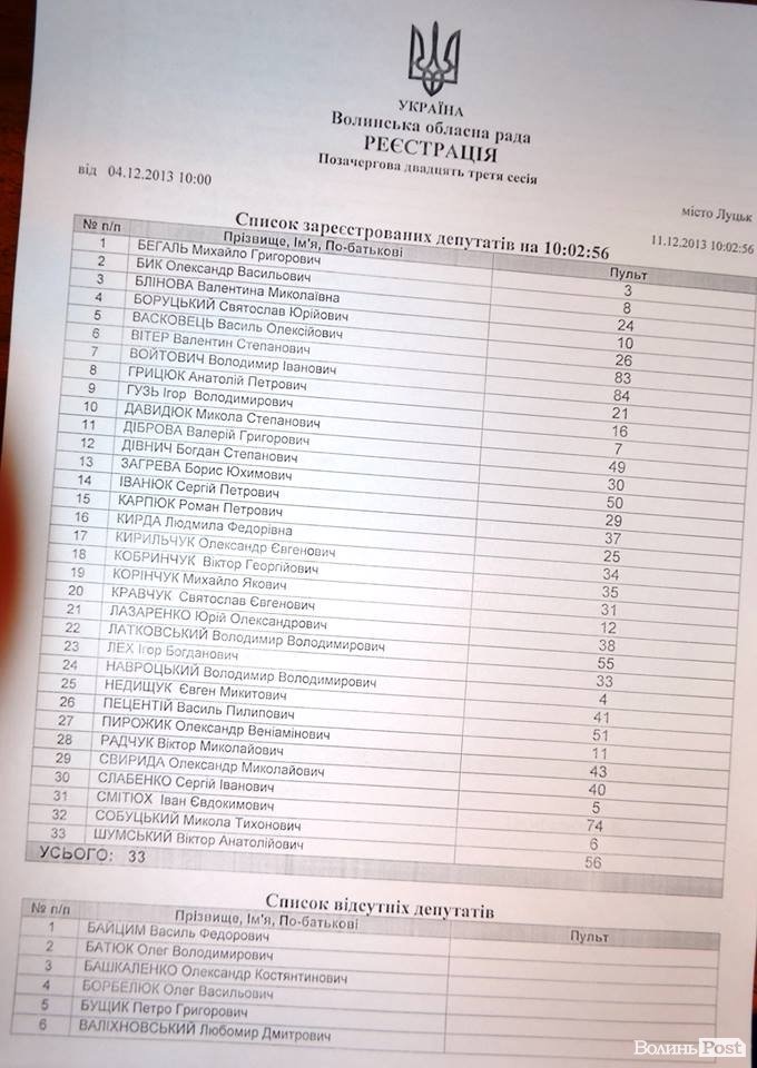 Співкоординатор Євромайдану Юлія Грищук опублікувала в Facebook список депутатів, які не прийшли на сьогоднішню сесію Волиньради. Їх назвали зрадниками України.