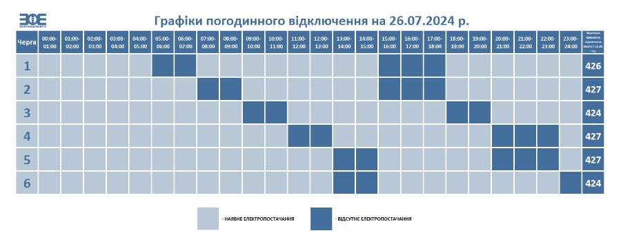 У п'ятницю, 26 липня, графіки відключень світла застосовуватимуться з 05:00 і до кінця доби.