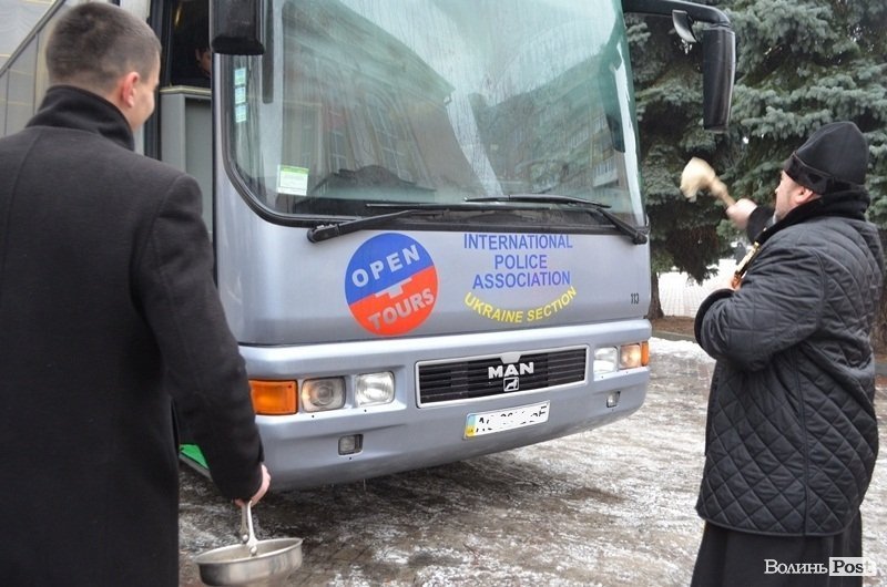 Перед виїздом колону окропив свяченою водою, благословивши людей на поїздку, священик Свято-Троїцького собору.