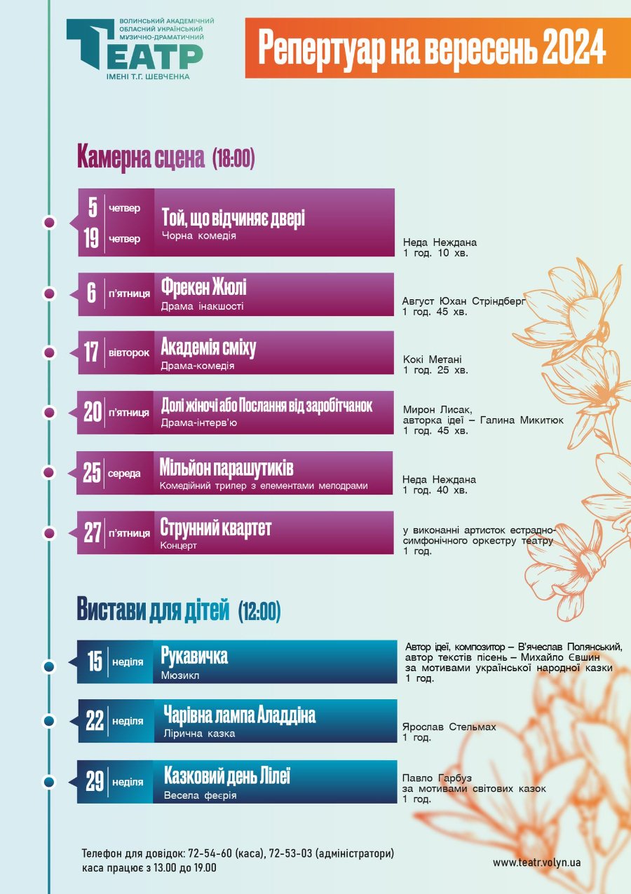 Волинський академічний обласний український музично-драматичний театр імені Тараса Шевченка підготував для поціновувачів театрального мистецтва анонс вистав та концертів, що відбудуться у вересні.
