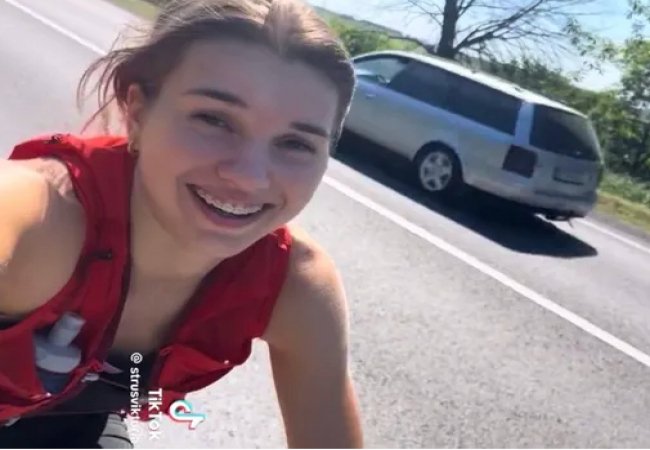 Через певний час дівчина вже почала скаржитися на біль у сідницях та колінах. На 40-му кілометрі у неї закінчилась вода, тому робила перерву на АЗС. Разом з тим і змінила свого залізного коня. З новим, зі слів Вікторії, набагато легше їхати. Крім води, вона ще перекусила і знову рушила підкорювати цей шлях.