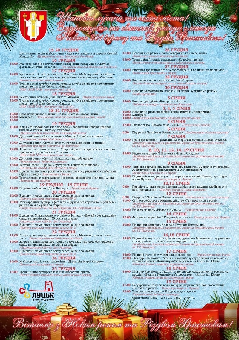 Традиційно для лучан та гостей на Театральному майдані міста будуть організовані міжнародний етнофестиваль «Різдво у Луцьку», міський фестиваль вертепів «З Різдвом Христовим!», дитячий святковий фестиваль «Зимова казка – 2014».