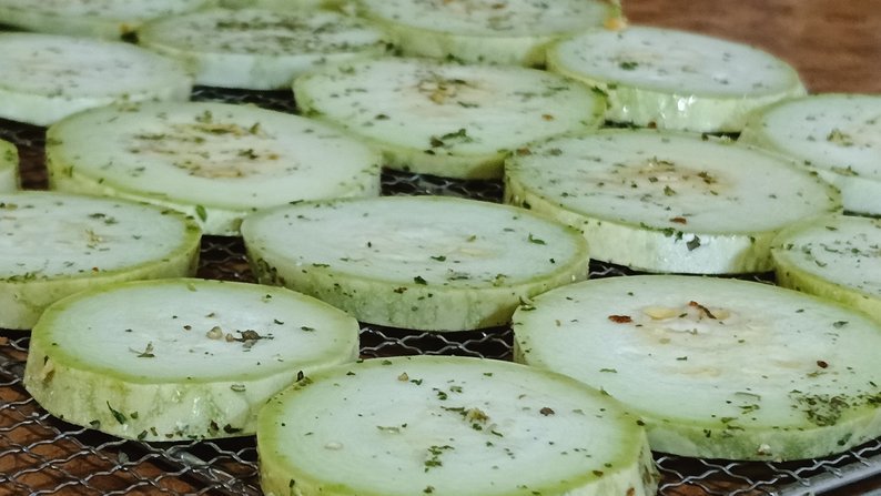 Кабачок жінка шаткує, додає сіль та спеції та ставить сушитися у спеціальну сушку – регідратор. Його придбали спеціально для розвитку бізнесу. Сюди вміщається 12 кілограмів кабачків. З одного — отримує приблизно 60 грамів снеків.