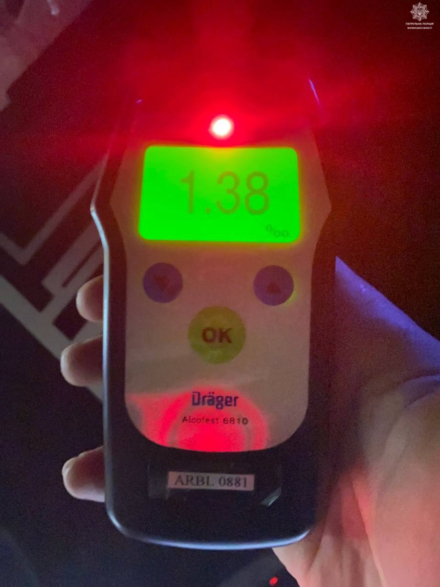 Під час спілкування з керманичем патрульні помітили у нього ознаки алкогольного сп’яніння. Чоловік погодився пройти тест за допомогою приладу Драгер. Результат — 1, 38 проміле.