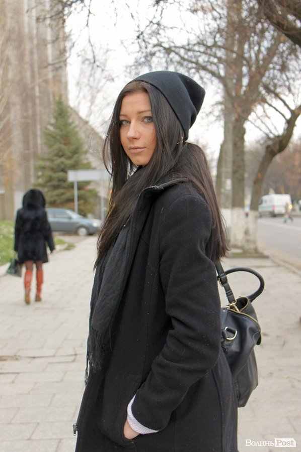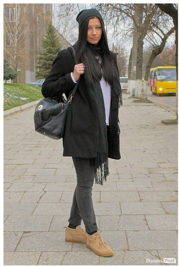 "Образ надто буденний, але зручний. Найцікавіше - сережки. Шапка обтягнена не зовсім правильно: ззаду необхідно закладати складку. Для підтримки взуття краще підібрати шарф такого ж кольору, він буде також освіжати обличчя".