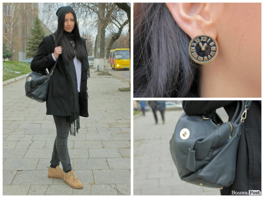 Аксесуари: чорний шарф та сумка, сережки у формі годинника.