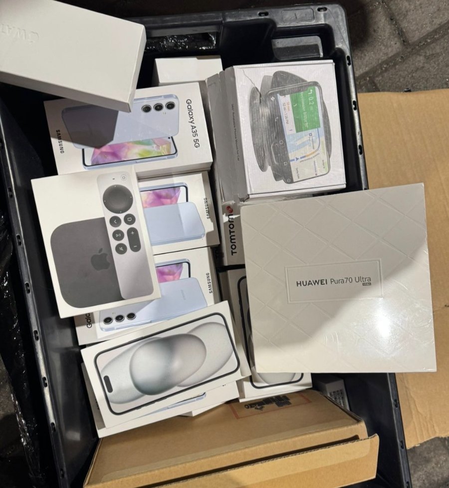Загалом 78 мобільних телефонів, планшетів, смарт-годинників та аксесуарів до них містились у двох пластикових коробках, розміщених у багажному відділенні.