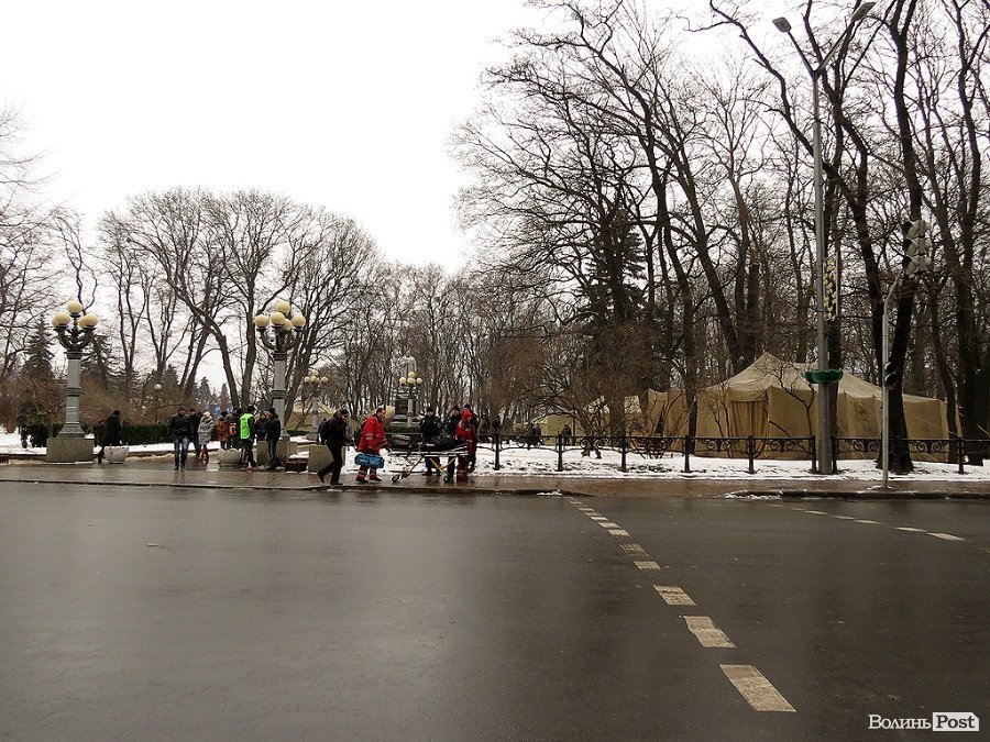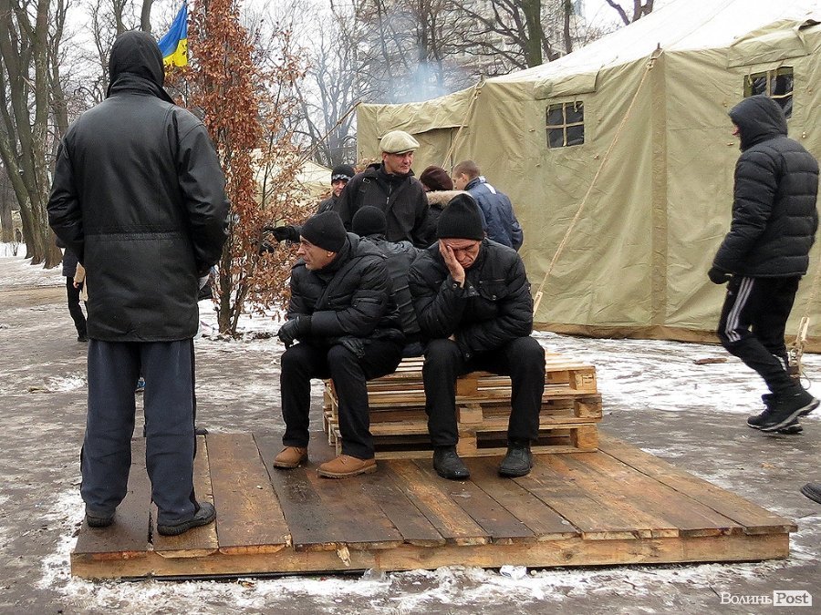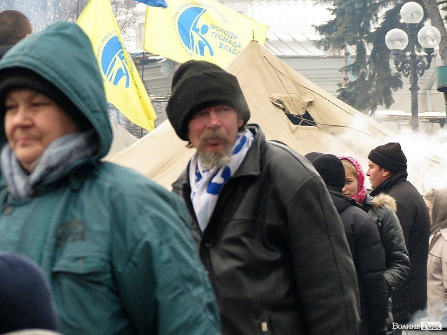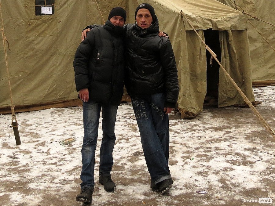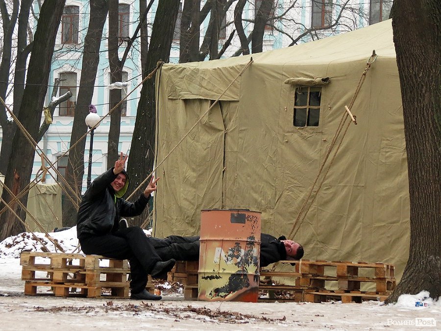 Дійшла до чергового перехрестя, стою, думаю, куди полізти, але не влізти. Підходять до мене двоє хлопаків сумнівної зовнішності. Я би сказала, що вони тут не перший тиждень, або й не перший рік. "Дєвушка, чо тут стоїте? Сфотографіруйте нас" - фотографую. "А коли дєньгі за Януковіча будуть давать?" - "Не знаю". - "Тут стоїте і не знаєте?" - "Ні, а ви звідки?" - "Тернопіль. А ви?" - "Луцьк, Волинська область". - "А ето десь на сході?" - "Що ж ви, хлопці, кажете, що з Тернополя, а де Волинь не знаєте". Це були Володимир і Сєрий.
