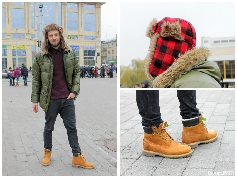 На фото: куртка NEWYORKER, джинси, светр PULLBEAR, чорна сорочка, шапка в червоно-чорну клітинку, черевики TIMBERLAND.