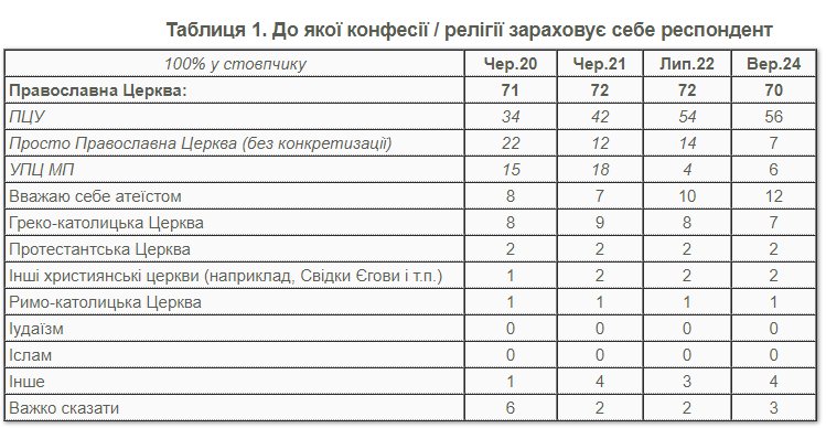Також, згідно з результатами опитування, найбільше українців – 70% – вважають себе православними. Серед них найбільше – 56% серед усіх респондентів – зараховують себе до Православної Церкви України, що становить 81% серед усіх православних мешканців України. Ще 7% зараховують себе до Православної Церкви «без конкретизації» і 6% – до Української Православної Церкви Московського Патріархату.