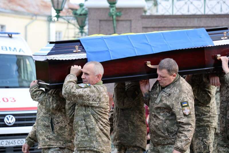 Після завершення богослужіння труну з тілом покійного захисника пронесли Театральним майданом. Біля фотостенда пам’яті загиблих Героїв присутні зупинилися і виконали Державний Гімн України.