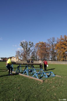 Дві колоди (основа) довжиною 6 м розміщені паралельно на землі. На основі розміщуються 4 перешкод висотою 50 см, 70 см, 90 см, 110 см. Поперек основи лежить колода вагою 200 кг, яку треба буде переставляти.