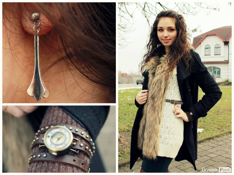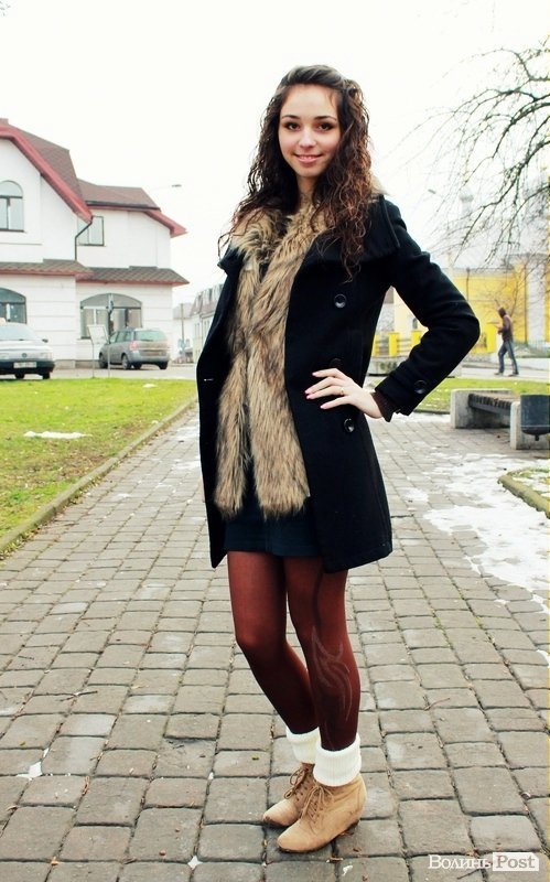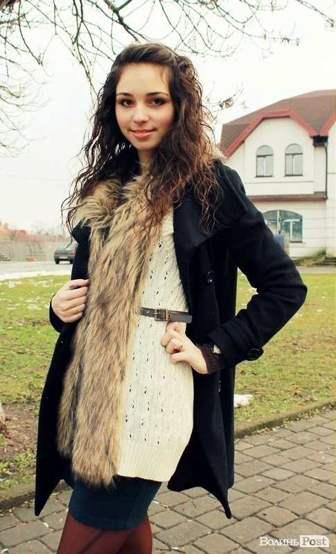 На фото Валерія одягнена у чорне пальто H&M, жилет білого кольору із хутром COLIN'S, коричневий светр SUTHERLAND та спідницю темно-зеленого кольору COLIN'S.