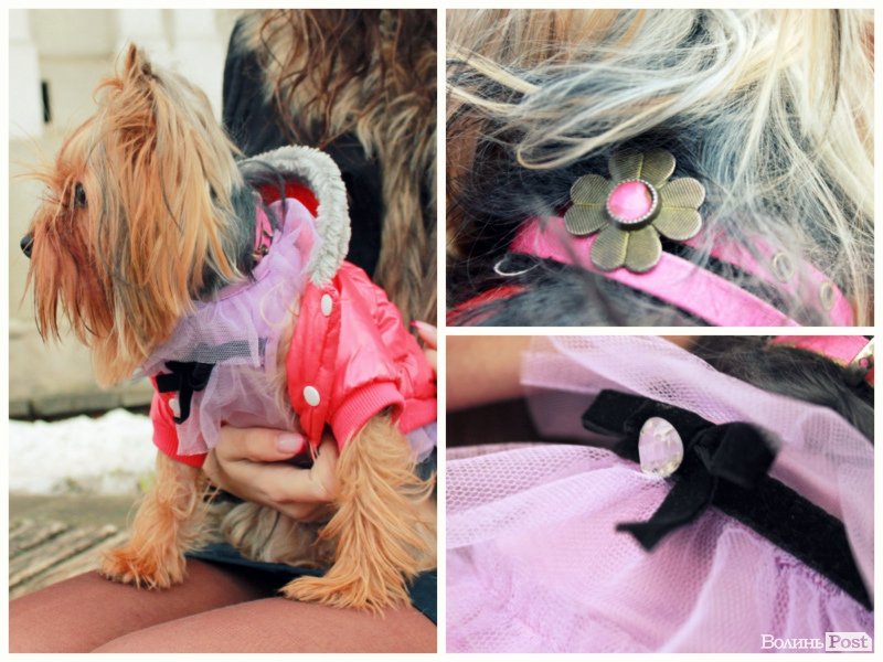 Буся - у яскравому та зручному вбранні: куртці червоного кольору із капюшоном та фіолетовій сукні, декорованій чорними бантиками. З аксесуарів - рожевий нашийник із квіточкою.