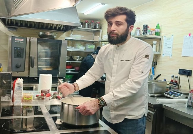 10 років Темо разом із сім'єю проживає в Україні. Готує в ресторанах у Карпатах. Він вдесяте, як волонтер, безплатно готує страви від шефа.
