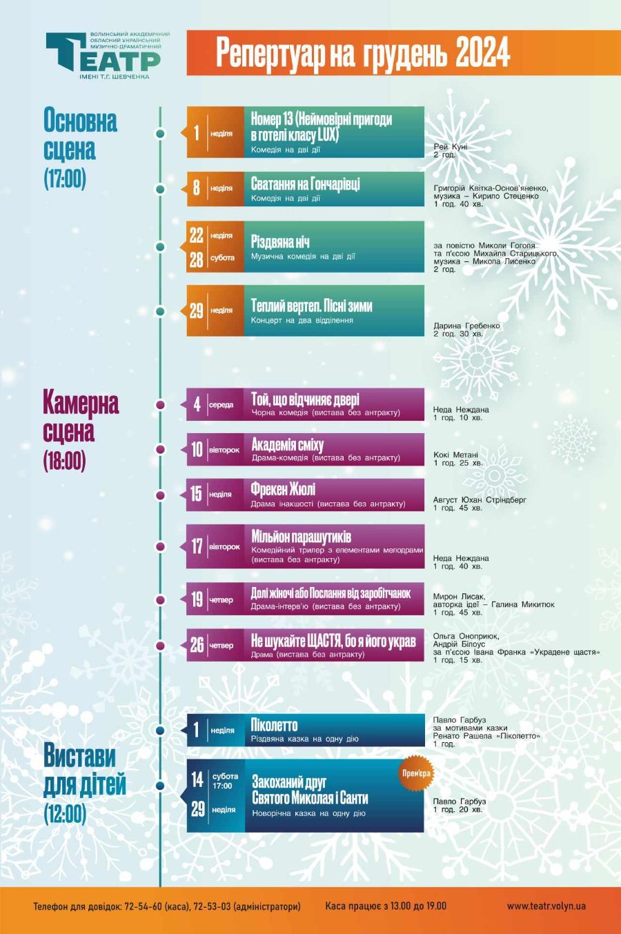 «Цієї зими театр запрошує поринути у магію мистецтва! У грудні для глядачів відбудуться святкові прем'єри, улюблені класичні постановки та яскраві вистави для всієї родини. Створімо казковий настрій разом на незабутніх театральних вечорах!» – йдеться в повідомленні.