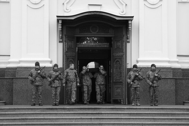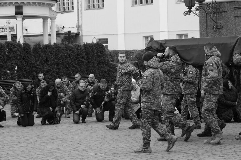 Після завершення богослужіння труну з тілом покійного захисника пронесли Театральним майданом. Біля пам’ятного фотостенда загиблим Героям присутні зупинилися і виконали Державний Гімн України.