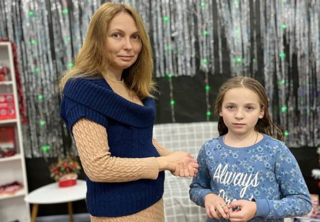 Постійна відвідувачка бібліотеки, мама трьох дітей, лучанка Діана Коротєєва прийшла на благодійний марафон з найстаршою донькою Мариною. Мама каже, що дівчинка мріє стати перукарем та дуже любить робити собі та іншим зачіски. Дівчинці плели колоски.