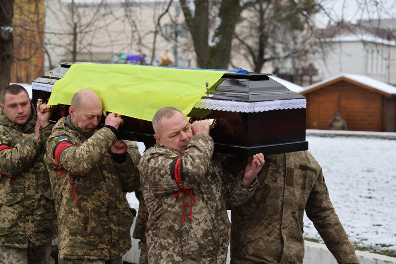 Після завершення богослужіння труни з тілами полеглих захисників пронесли Театральним майданом. Біля пам’ятного фотостенда загиблим Героям присутні зупинилися і виконали Державний Гімн України.