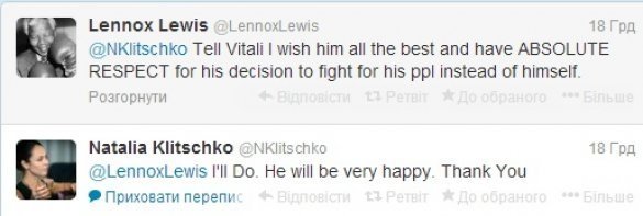 «Скажи Віталію, що я бажаю йому всього найкращого, і висловлюю йому АБСОЛЮТНУ ПОВАГУ за його рішення боротися за свій народ, а не тільки за себе», ‒ написав екс-чемпіон у Twitter дружини Кличка-старшого Наталії.