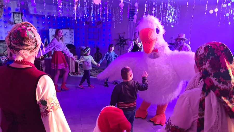 Сюжет розваг теж розвивався навколо основних персонажів казки. Дітей перетворювали на козачат, одягаючи дівчаткам віночки, а хлопчикам – пояси, вони змагалися з ковалем, хто вправніший та сильніший. А святого Миколая із рук Зміючки Оленки та її матері визволяв Івасик-Телесик з Гусем. Тож діти були учасниками дійства про добро та зло, дружбу та відвагу, намагались перевиховати зміючок та гарно потрудились у Майстерні святого Миколая, де виготовляли різноманітні новорічні прикраси з еко-матеріалів – сіна, шишок, горіхів. Пригощали дітлахів «білим снігом» та «півниками».