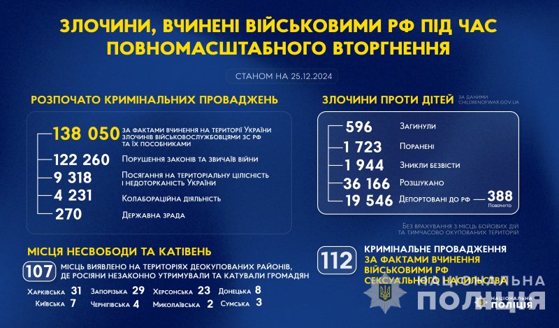 З початку повномасштабного вторгнення росії в Україну слідчі Національної поліції України розпочали 138 050 кримінальних проваджень за фактами вчинення на території України злочинів військовослужбовцями збройних сил російської федерації та їхніми пособниками.