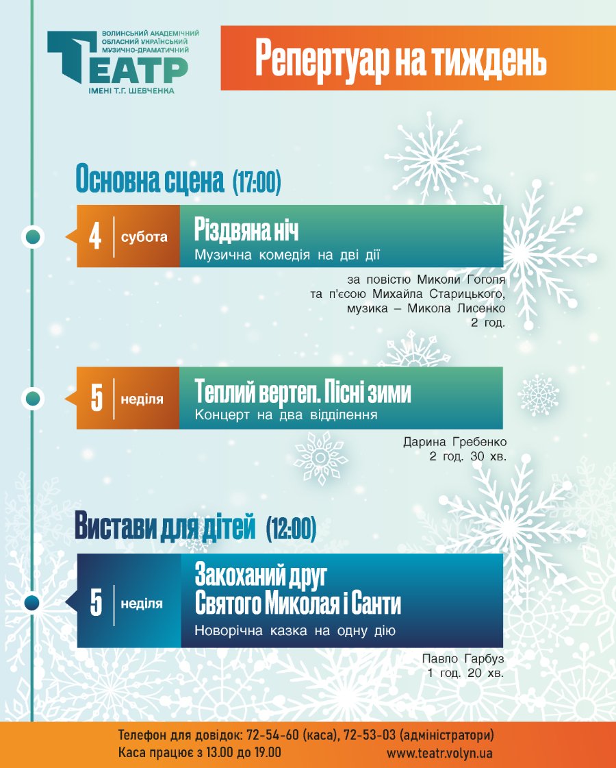 У суботу, 4 січня, о 17:00 – музична комедія на дві дії «Різдвяна ніч» за повістю Миколи Гоголя та п'єсою Михайла Старицького, музика Миколи Лисенка. Тривалість – 2 години (антракт – 15-20 хвилин).