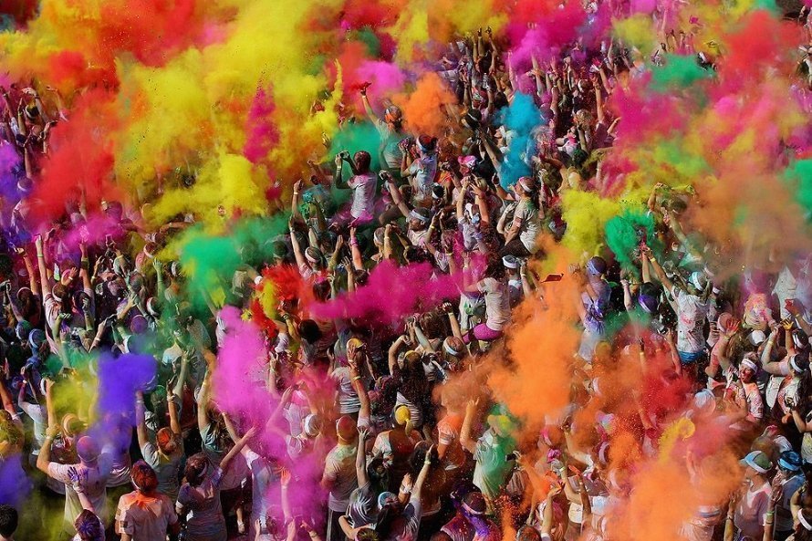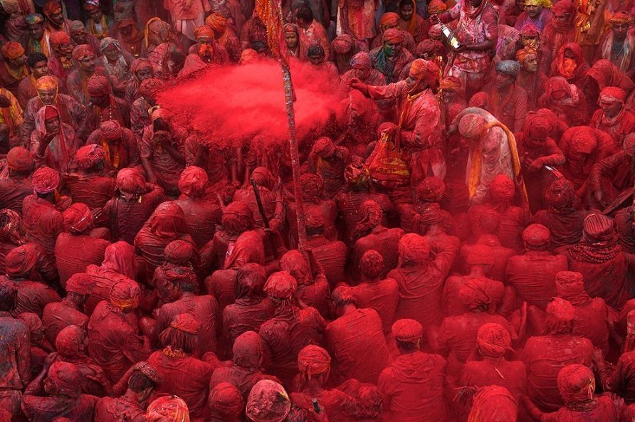 52. Людей, які зібралися біля Храму Крішни в Шріджі, поливають водою з фарбою. Цей фестиваль - двійник свята Холі в Барсанов