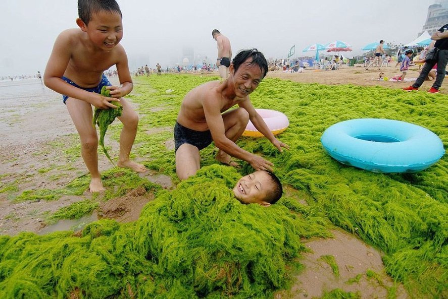 35. Чоловік зі своїм сином в китайській провінції Циндао, де сталося небувале нашестя зелених водоростей. З червня з міських пляжів вивезли понад 50,000 тонн водоростей