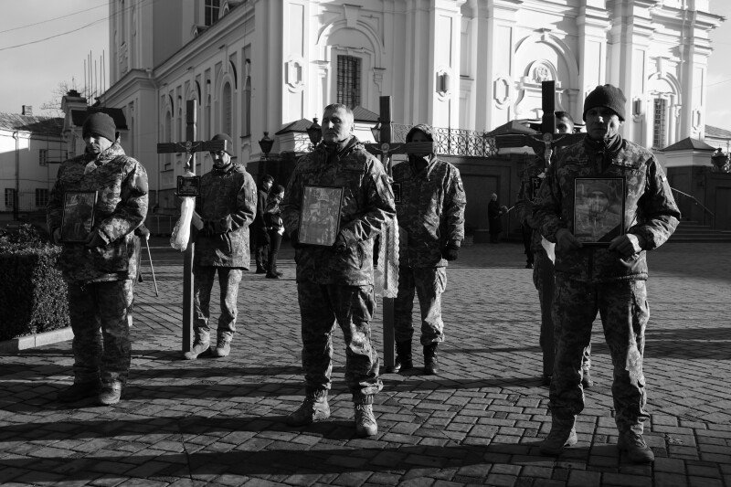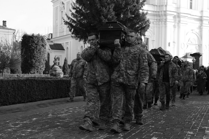 Після завершення богослужіння труни з тілами полеглих захисників пронесли Театральним майданом. Біля пам’ятного фотостенда загиблим Героям присутні зупинилися і виконали Державний Гімн України.