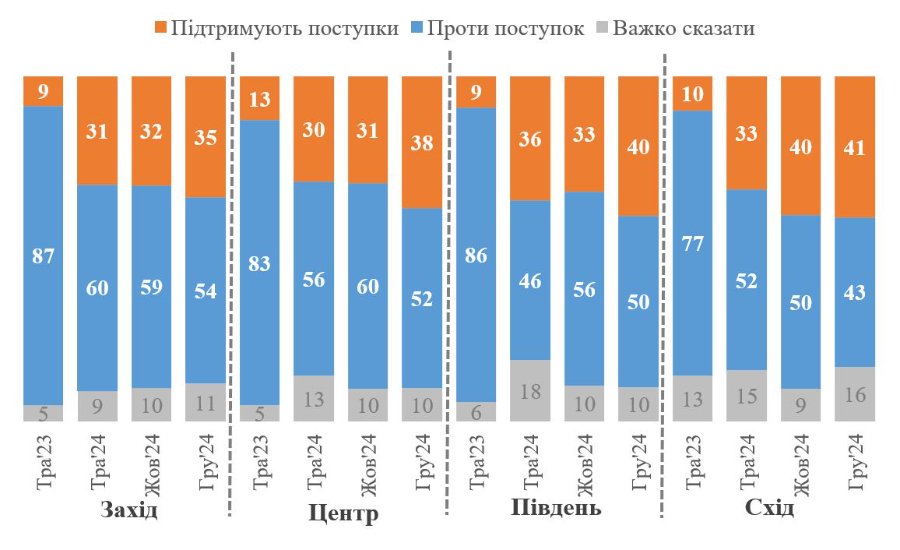 У дослідженні йдеться: якщо між травнем і початком жовтня 2024 року ситуація фактично не змінилася, то в період між початком жовтня і груднем простежується зростання з 32% до 38% частки тих, хто загалом готовий до певних територіальних поступок. При цьому частка тих, хто категорично проти будь-яких поступок, знизилася.