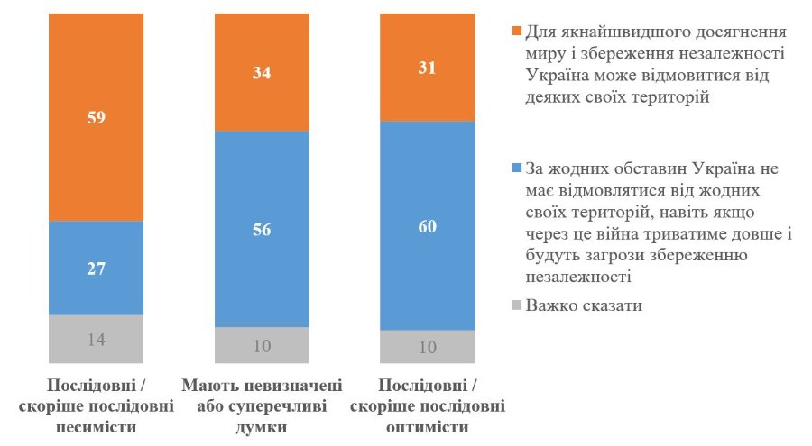 "Серед песимістів 59% вважають, що варто йти на певні територіальні поступки, категорично проти – 27%. Серед оптимістів ситуація дзеркально протилежна – 60% виступають категорично проти будь-яких поступок, а 31% загалом готові до певних поступок. Важливо при цьому звернути увагу на категорію тих, хто має суперечливі або невизначені думки – вони за своїми поглядами щодо поступок майже ідентичні до оптимістів", – наголосили у КМІС.