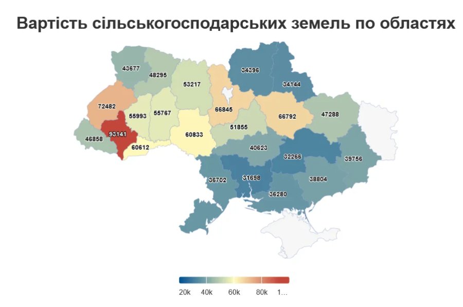 Загалом же ціни на гектар землі в областях України коливаються від середніх 31 698 до 93 141 грн. Тобто вартість 1 га у найдорожчій області дорівнює майже 3 га у найдешевшій.