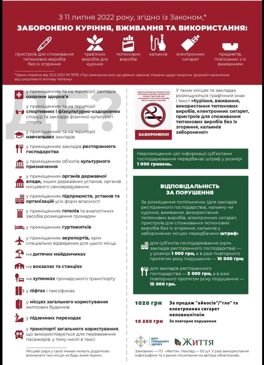 – Так, адже Верховна Рада України ще у липні 2022 року, прийнявши зміни до ст. 13 та ст. 16 Закону України "Про заходи щодо попередження та зменшення вживання тютюнових виробів і їх шкідливого впливу на здоров'я населення". Тоді був встановлений доволі вичерпний перелік місць, де заборонено вживати та пропагувати будь-яким чином тютюнопаління, а також стимулювати продаж тютюну. Йдеться, у тому числі й про кальяни.