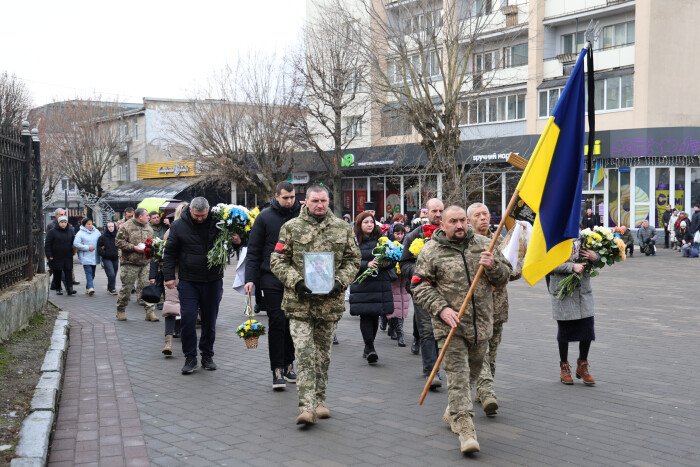 Після завершення богослужіння труну з тілом покійного захисника пронесли Театральним майданом. Біля пам’ятного фотостенда загиблим Героям присутні зупинилися і виконали Державний Гімн України.
