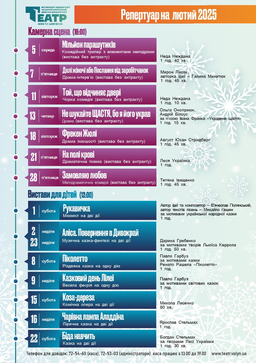 «Лютий – час наповнити серце мистецтвом! Наш репертуар подарує глядачам моменти радості, натхнення та незабутніх вражень. Обирайте виставу, яка торкнеться вашої душі, і дозвольте театру стати частиною вашої зими!» – йдеться у повідомленні.