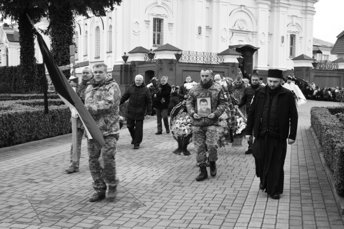 Після завершення богослужіння домовину з тілом покійного захисника пронесли Театральним майданом. Біля пам’ятного фотостенда загиблим Героям траурна процесія зупинилися і виконала Державний Гімн.