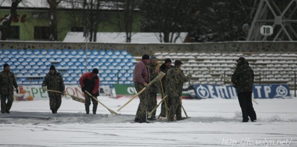 Луцький стадіон «Авангард» у ці дні посилено готують до матчу «Волині» й «Чорноморця»: газон накрили плівкою, з якої періодично зчищають сніг.