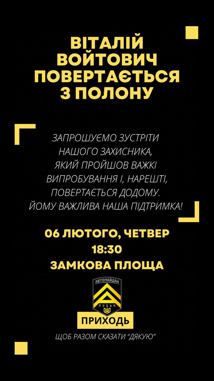 "Долучайтесь до зустрічі. Візьміть з собою державний прапор, щоб організувати «живий ланцюжок». Віталій Войтович повертається з полону. Запрошуємо зустріти нашого захисника, який пройшов важкі випробування, і, нарешті, повертається додому", - йдеться в повідомленні.