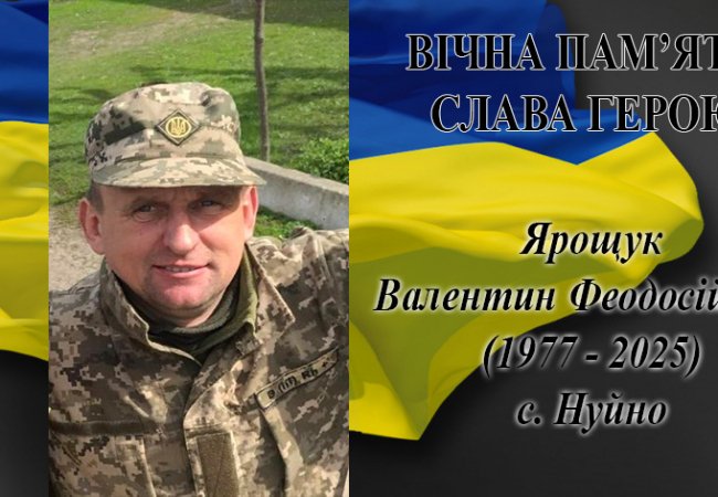 Під час виконання бойового завдання героїчно загинув молодший сержант 115 бригади ЯРОЩУК ВАЛЕНТИН ФЕОДОСІЙОВИЧ, 03.01.1977 року народження, житель села Нуйно.